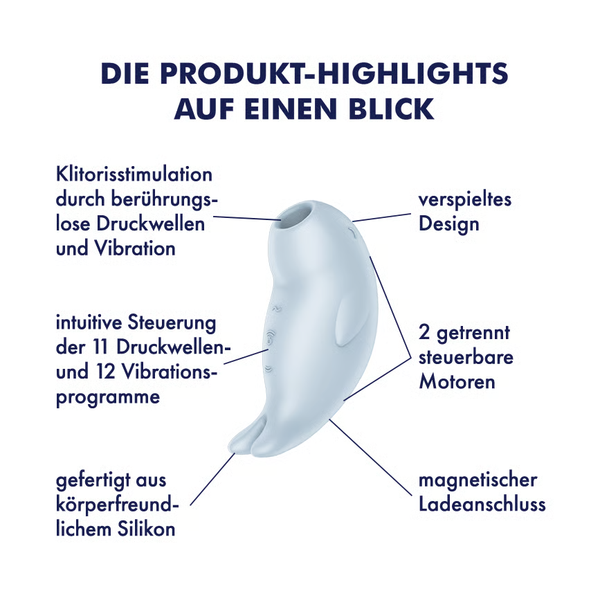 Der Satisfyer Seal You Soon verbindet verspieltes Design mit wirkungsvoller Klitorisstimulation und ist ideal für alle, die Druckwellen und Vibration erleben möchten. Die Air Pulse Technologie stimuliert die Klitoris berührungslos mit intensiven Impulsen, während die zusätzliche Vibrationsfunktion für noch mehr Abwechslung sorgt. Beide Funktionen lassen sich unabhängig voneinander steuern, sodass du selbst entscheidest, ob du nur Druckwellen, nur Vibration oder die Kombination aus beidem genießen möchtest. Mit 11 Druckwellenintensitäten und 12 Vibrationsprogrammen bietet der Seal You Soon vielseitige Möglichkeiten. Das superweiche Silikon in medizinischer Qualität fühlt sich angenehm glatt auf der Haut an und macht das Toy besonders hygienisch und komfortabel in der Anwendung. Durch seine kompakte Form liegt es gut in der Hand und eignet sich hervorragend für unterwegs.