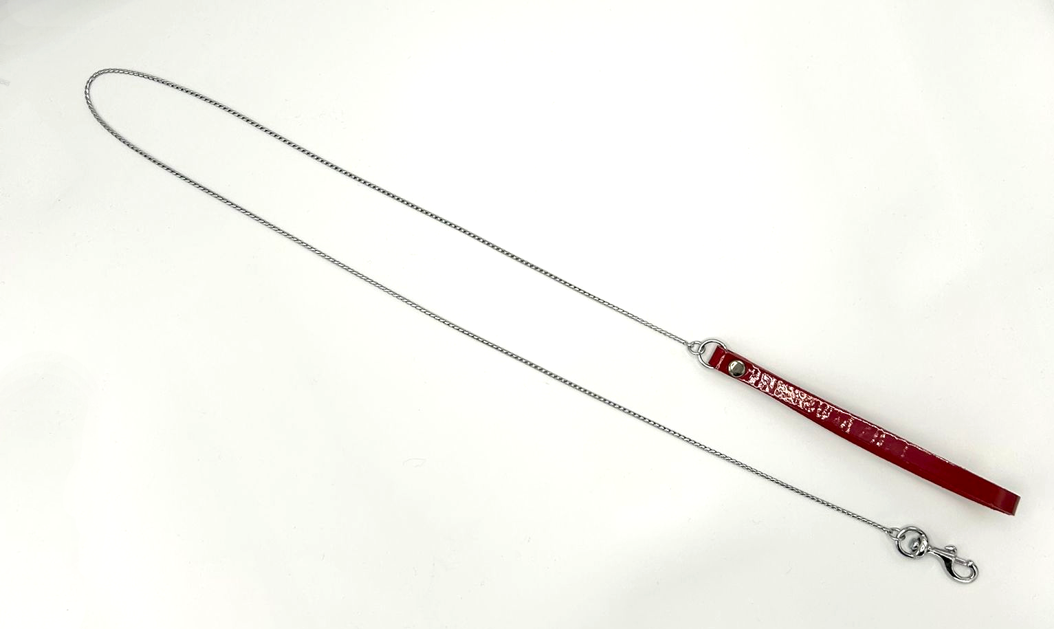 Die silberfarbene Führungsleine besticht durch ihre Schlangenkette aus vernickeltem Messing und einer auffälligen Handschlaufe aus Rindsleder mit einer glänzenden roten Lackoberfläche.